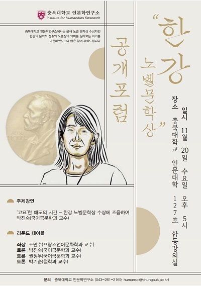 [충북=위키트리 장해순 기자] 충북대 인문학연구소가 11월 20일 오후 5시 인문대학 127호 합동강의실에서 올해 노벨문학상 수상자인 한강의 문학적 성취와 노벨상의 의미를 짚어보는 ‘한강 노벨문학상’ 공개포럼을 개최한다.