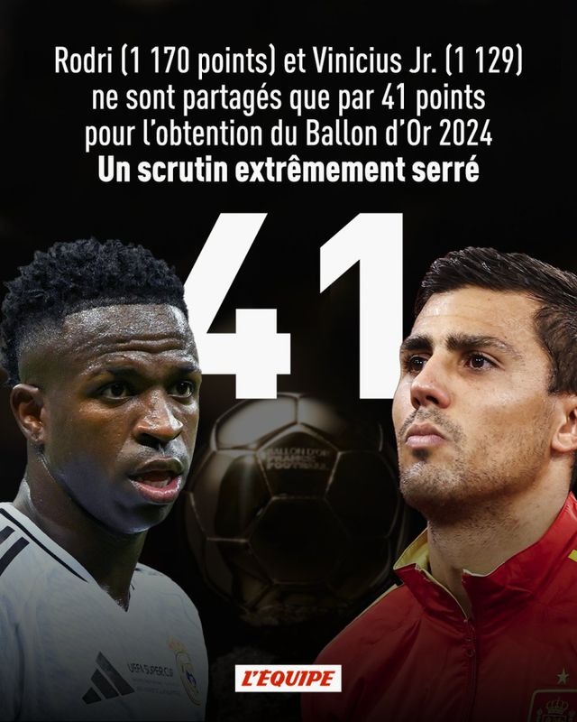 최고의 축구 선수에게 주어지는 발롱도르 시상식의 투표 내역이 프랑스 현지 매체로부터 일부 공개됐다. 특히 수상자인 로드리(맨체스터 시티)와, 2위를 차지한 비니시우스 주니오르(레알 마드리드)의 격차가 단 41점에 불과하다는 사실이 알려져 눈길을 끌었다.
