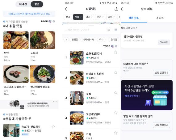 이 밖에도 ‘티맵랭킹’ 서비스를 통해 현 위치 혹은 목적지 일대 맛집을 티맵 이용자들의 이동 데이터를 기반으로 1위부터 50위까지 선정한 맛집 리스트를 확인할 수도 있다. 현재 영업 시간과 예약 또는 웨이팅, 주차 가능 여부 등을 필요에 따라 우선 설정하면 이에 맞게 추천 리스트가 필터링된다.