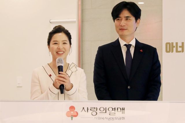 개그우먼 김지선·김현민 부부가 2020년 서울 중구 사랑의열매회관에서 열린 '아너소사이어티' 300번째 가입식에 참석해 인사말을 하고 있다. / 뉴스1