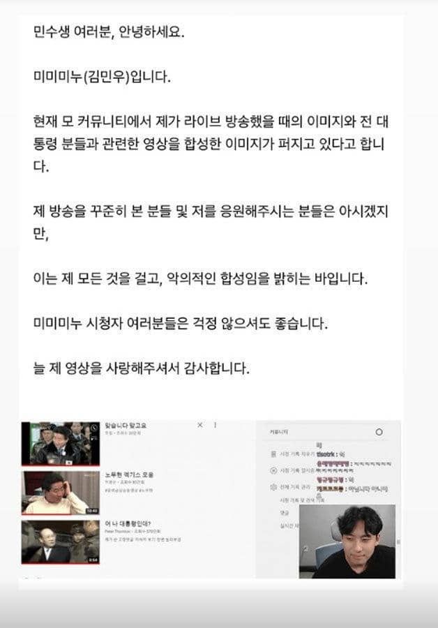 이에 미미미누는 "현재 모 커뮤니티에서 제가 라이브 방송했을 때의 이미지와 전 대통령 분들과 관련한 영상을 합성한 이미지가 퍼지고 있다고 한다"라고 상황을 설명했습니다.