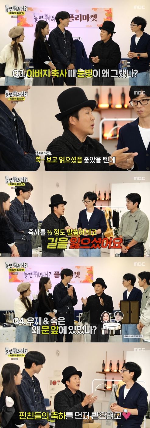 조세호는 "아버지가 쭉 보고 읽으셨음 좋았는데, 다 외우시다 보니 2/3 지점부터 길을 잃으셨다"라며 표정 관리가 안 됐던 이유를 밝혔다.