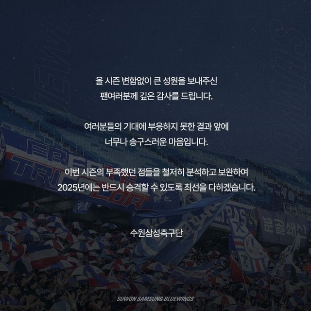 수원은 9일 구단 공식 채널 등을 통해 “올 시즌 변함없이 큰 성원을 보내주신 팬 여러분께 깊은 감사를 드린다”고 운을 뗀 뒤 “여러분들의 기대에 부응하지 못한 결과 앞에 너무나 송구스러운 마음이다. 이번 시즌의 부족했던 점들을 철저히 분석하고 보완해 2025년에는 반드시 승격할 수 있도록 최선을 다하겠다”라고 전했다.