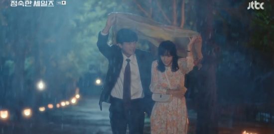 그러나 김도현은 버려져 있는 마대를 주웠고, 한정숙과 함께 마대로 머리를 가리고 비를 피했다.