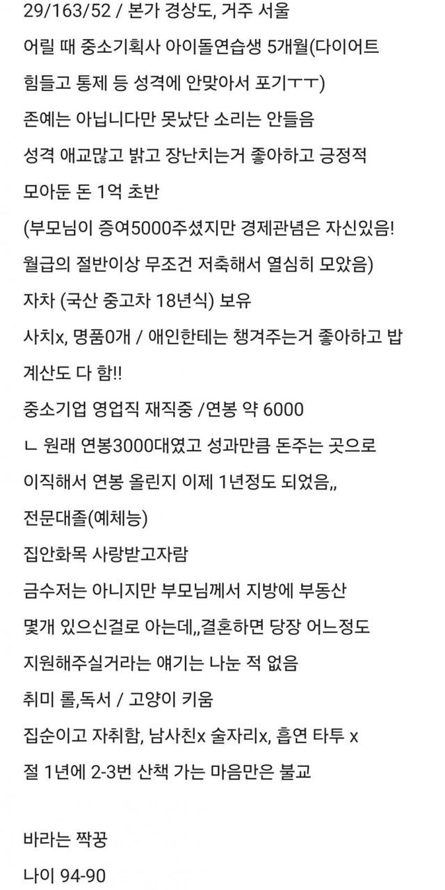 29살 163센치 52키로(어릴 때 아이돌 연습생 정도 와꾸)