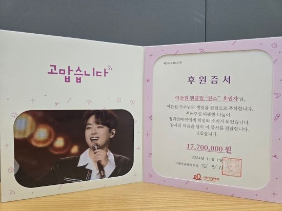 (엑스포츠뉴스 이정범 기자) 이찬원 팬클럽 '찬스'가 청각장애인 지원을 위해 1,770만 원을 기부했다.