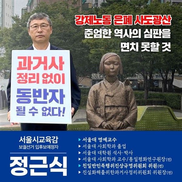 그럼에도 '진보진영'의 이번 서울시교육감 보궐선거는 후보 선출 및 선거운동 과정의 전반에 있어 윤석열 정권의 대일외교나 역사교육 정책 심판을 중심으로 진행되었다. 이런 분위기에서 선출된 후보는 일반 시민이나 학생, 학부모들을 대변하는 대신 조직 구성에 도움이 되는 유력하고 유명한 인사들의 지지를 얻는 일에 신경쓸 수밖에 없게 된다. 이런 현실 인식이 잘 집약된, 정근식 후보의 선거운동 도중 한 대담에서의 발언을 아래에 인용한다.
