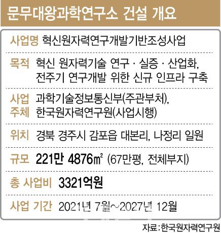 문무대왕과학연구소 건설 사업(혁신원자력연구개발기반조성사업)은 과학기술정보통신부가 지난 2021년 7월부터 오는 2027년 12월까지 경북 경주 감포읍 일원에 총 3321억원을 투자해 추진하는 사업이다. 총 부지만 67만평에 달해 원자력연 대전 본원(40만평) 보다 넓다.