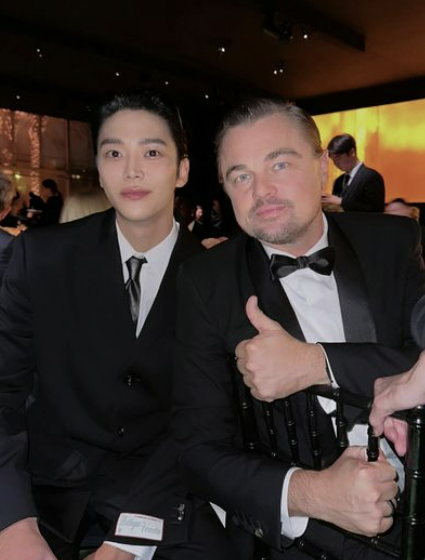 공개된 사진 속 로운은 할리우드 톱배우 레오나르도 디카프리오와 어깨를 나란히 카메라를 바라보고 있다. 블랙 수트 차림의 두 사람은 단정한 올백머리로 댄디한 분위기를 연출했다. 로운은 넥타이로, 디카프리오는 나비넥타이로 포인트를 줬다. 특히 디카프리오는 엄지 척을 하고 있어 눈길을 끌었다.