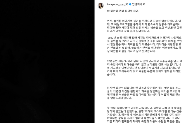 금일 1시경, 류화영은 인스타그램의 글을 통해 “불편한 이야기로 심려를 끼쳐드려 죄송하다”며 말문을 열었습니다. 그는 과거 티아라 활동 시절 겪었던 왕따와 폭행, 폭언 등의 사건을 회상하며, 이로 인해 큰 트라우마를 겪었지만 자신이 속했던 그룹을 존중하는 마음에서 지금까지 침묵을 지켜왔다고 밝혔습니다. 류화영은 “왕따 사건의 당사자로서 티아라의 해체를 보고 자책했고, 멤버들에게 항상 미안한 마음을 가지고 살아왔다”며 고백했습니다.