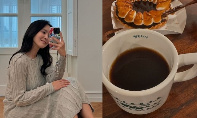 여러 개의 사진 중 머그컵 안에 앙증맞은 글씨로 적혀 있는 ‘행복하자’라는 글이 눈길을 끈다.