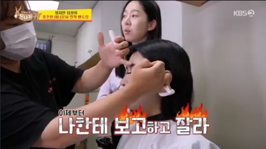 엄지인은 "나에 대한 반항이야?"라고 발끈하다가 "아나운서 머리는 쉽게 자르는 거 아니다. 이제 나한테 보고 하고 잘라"라고 말했다.