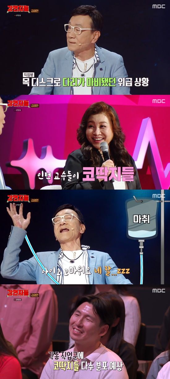 김영만은 보람됐던 순간을 언급하며 "직업병 때문에 목디스크가 눌렸다. 다리가 마비가 됐다. 병원가서 바로 다음날 수술을 받으려고 누웠는데 인턴 교수들이 코딱지들이었다"고 회상했다.