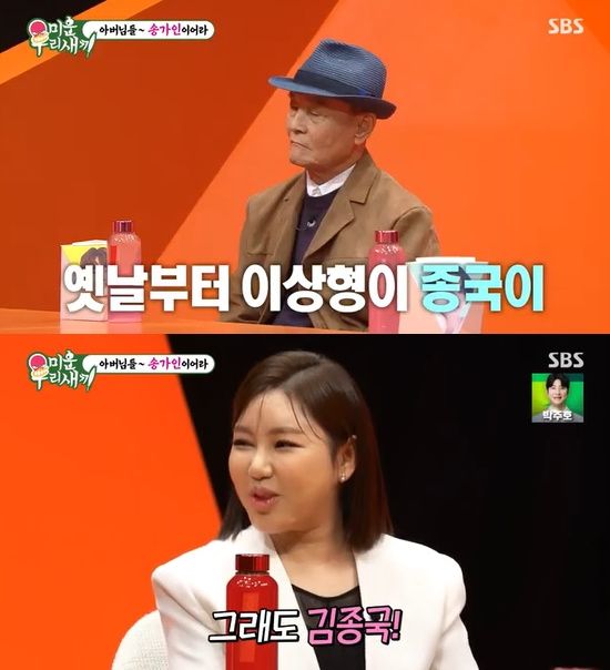 신동엽은 "가인 씨 이상형이 김종국이라고 한다"라며 송가인의 이상형을 밝혔다. 이어 "가인 씨같은 며느리가 집에 들어온다면 어떨 것 같으신가"라며 김종국 아버지에게 물었다.