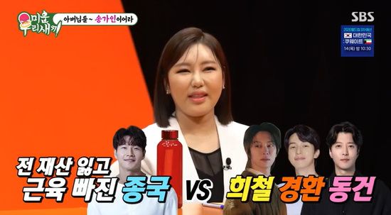 한편 서장훈이 송가인에 전 재산 잃고 근육 빠진 김종국과 김희철, 허경환, 이동건 중 한 명을 선택해야 한다면 누굴 하겠냐고 묻자 고민하던 송가인은 "그래도 김종국"이라며 팬심을 드러냈다. 이어 "돈은 제가 벌면되고 운동은 다시 하면 되지 않나"라며 선택 이유를 밝혔다.
