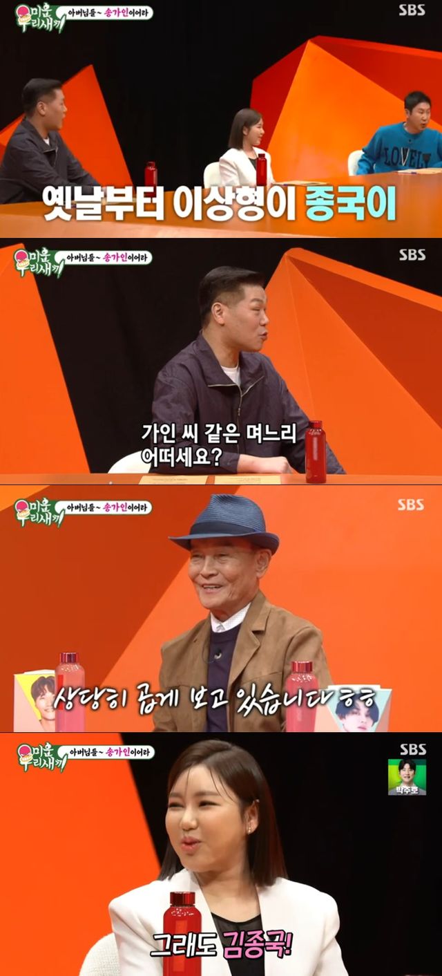 이날 스튜디오에는 모벤져스가 아닌 부벤져스가 출동했다. 신동엽은 “옛날부터 이상형 1위가 김종국이라고 한다”며 “만약 송가인 같은 며느리가 집에 들어온다면 어떨 것 같냐”고 물었다. 김종국 아버지는 “상당히 곱게 보고 있다”고 말하며 웃었다.
