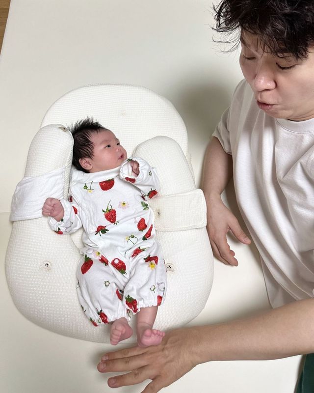 공개된 사진 속 전복이는 딸기 무늬가 그려진 옷을 입고 아빠 박수홍을 똘망똘망한 눈으로 바라보고 있다.