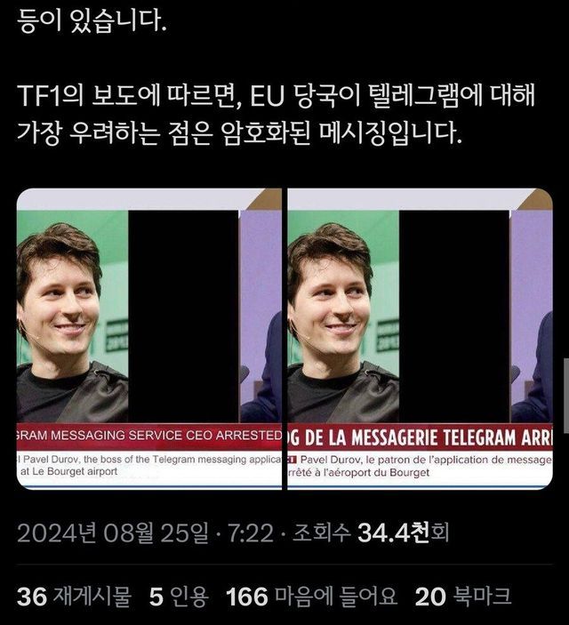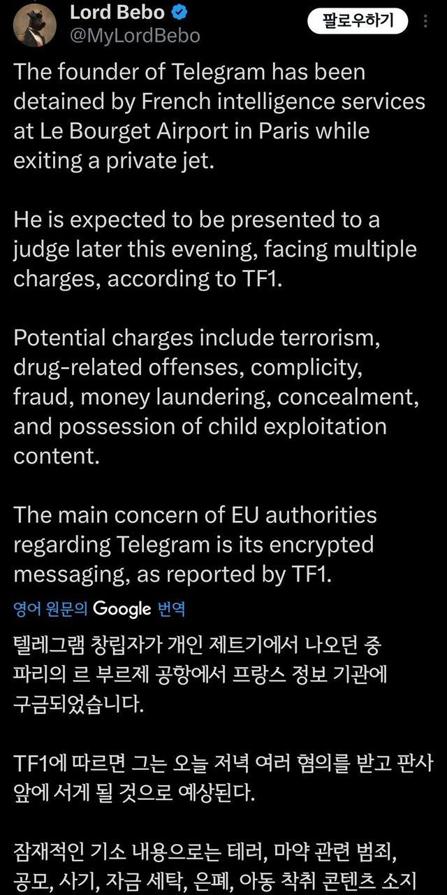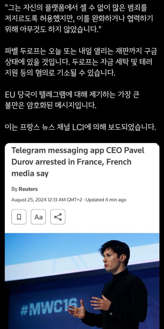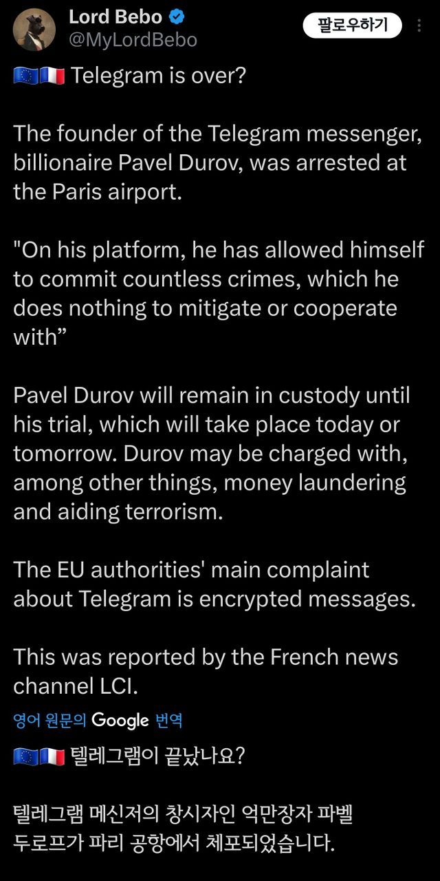 텔레그램 창업자 프랑스에서 체포.