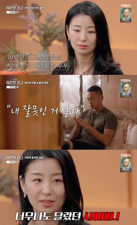 명서현은 '고부 갈등'이라는 단어 자체를 떠올리는 것도 힘들었다고. 그러면서 "친정 엄마도 모르던 사실인데 이젠 아신다. 걱정을 많이 했다. 혼자 약을 복용을 하면서까지 버틴 걸 알면 어떨지 많이 떨렸다"라며 어머니의 심정을 헤아렸다.