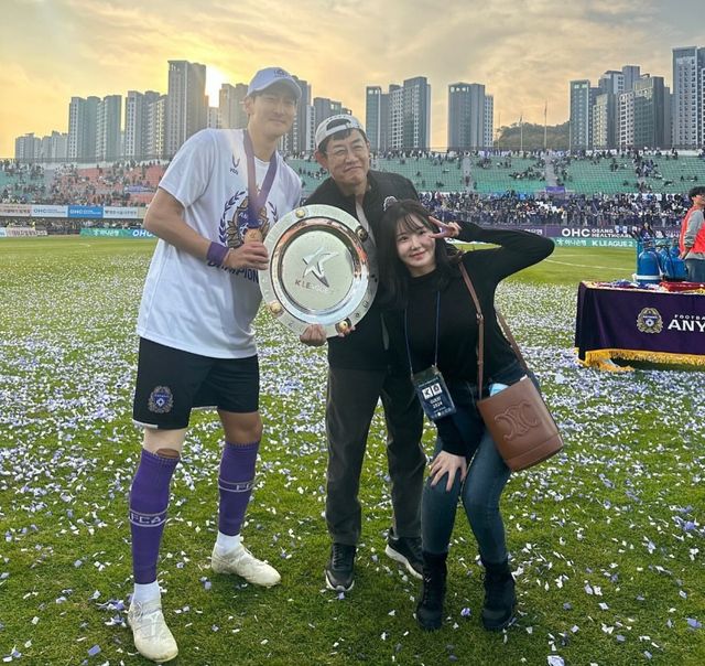 공개된 사진 속에는 이예림의 남편 김영찬이 속한 프로축구 FC안양의 창단 11년 만에 K리그 우승과 함께 1부리그 승격의 꿈을 이룬 FC안양 선수단 행사 모습이 담겨있다. 김영찬과 함께 아내 이예림, 장인어른 이경규까지 환한 미소를 지으며 시선을 사로잡는다.