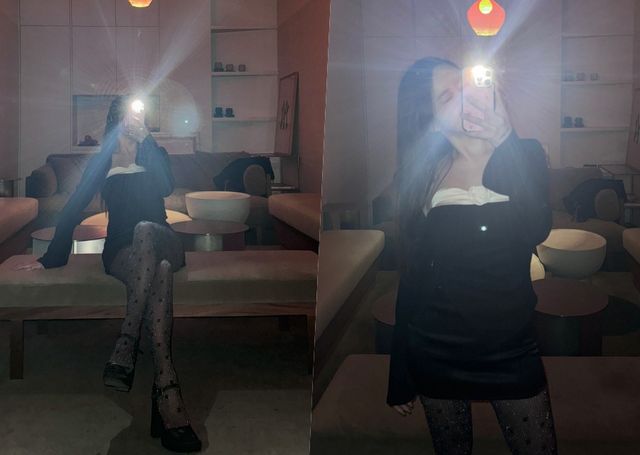 사진 속 정숙은 꽃 포인트가 있는 미니 원피스에 아찔한 망사 스타킹을 신고 거울에 비친 자신의 모습을 카메라에 담고있다. 정숙은 아름다우면서도 섹시한 자태로 시선을 사로잡는다.