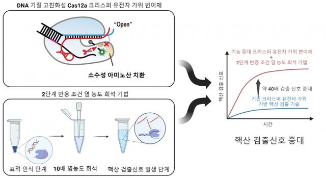 11일 연구팀에 따르면, 감염병 조기 진단에 중요한 핵산 기반 검출 기술의 민감도를 대폭 향상시켜 현장에서 신속하고 정확하게 감염병을 진단하도록 한 것이 이번 연구의 핵심이다. 고도화된 크리스퍼 유전자 가위 기반 진단 기술로 검출 성능을 획기적으로 향상함으로써 감염병 확산을 보다 효과적으로 제어할 수 있는 길이 열린 것이다.