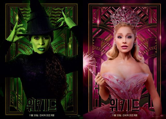 먼저 검정 모자를 고쳐 쓰는 ‘엘파바’(신시아 에리보 분)의 덤덤하면서도 결연한 표정을 담은 포스터는 극중 그녀에게 펼쳐질 사건들에 대한 궁금증을 더하는 동시에 ‘위키드’를 손꼽아 기다려온 관객들의 가슴을 뛰게 만든다. 이어 화려한 왕관과 마법봉을 든 ‘글린다’(아리아나 그란데 분)의 모습은 앞선 엘파바와는 다른 밝고 사랑스러운 모습으로 엘파바와 그녀가 보여줄 특별한 우정에 대한 기대를 높인다. 여기에 엘파바의 능력을 알아본 쉬즈 대학교의 총장 ‘마담 모리블’(양자경 분)과 엘파바를 에메랄드 시티로 초대한 ‘마법사’(제프 골드브럼 분)의 미스터리하고 범접 불가 아우라 넘치는 모습은 극의 몰입감을 높일 것을 예고, 시선을 뗄 수 없게 만든다.