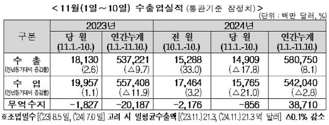 관세청은 11월1~10일 수출액이 149억1000만달러(약 20조8000억원)로 지난해 같은 기간보다 17.8% 감소했다고 11일 밝혔다. 주된 감소 요인은 조업일수가 지난해 8.5일(토=0.5일)에서 7일로 줄어든 데 따른 것이다. 그러나 조업일수 영향을 배제한 일평균 수출액도 0.1% 줄었다.