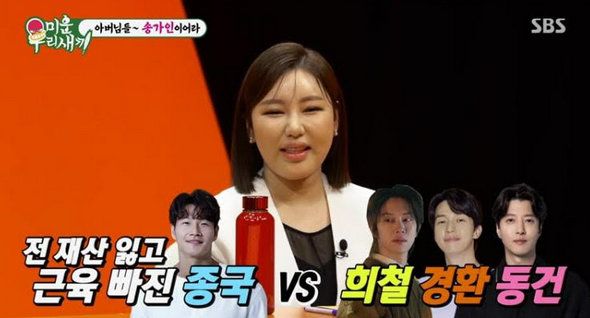 송가인은 “전 재산 잃고 근육 빠진 김종국과 희철, 경환, 동건 중 한 명을 고른다면 누구랑 결혼하겠느냐”라는 서장훈의 질문에 “그래도 김종국”이라고 대답했다. 그는 돈은 제가 벌면 되고 운동은 다시 하면 된다”라고 쿨한 답변을 내놨다.