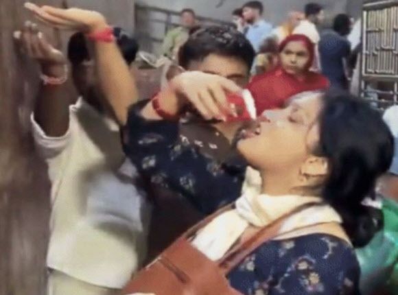 엑스(X·옛 트위터) 등 SNS에 올라온 영상에는 신도들이 줄을 지어 코끼리 조각상의 입 부분에서 흘러나오는 물을 종이컵에 받아 마시거나 물을 그대로 맞는 모습이 담겨있다. 이 물은 신도들 사이에서는 힌두교의 8번째 화신 크리슈나의 발에서 나오는 성수로 여겨져왔다.