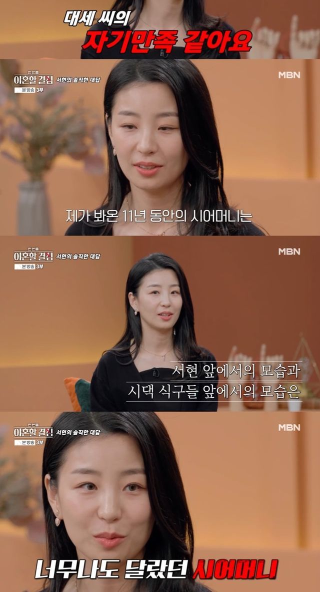 명서현은 "제가 봐 온 11년 간의 시어머니는 두 얼굴이다. 아들 앞에선 한없이 약하고 착한 엄마였다. 화 나면 욱해서 막말한다고는 하지만 그럴 수 있다. 그런데 제 앞에서의 어머니, 가족 앞에서 어머니는 너무너무 다르시다"라며 두 얼굴의 시모를 언급했다.