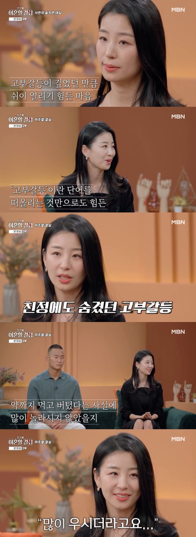 이날 명서현은 "고부갈등 단어 자체를 좋아하지 않는다. 갈등이라는 단어는 저한테도 원인이 있다. 그런데 친정 엄마에게도 말하지 않고 혼자 끙끙 앓았다. 사실 많이 걱정했다. 약을 복용하면서까지 버틴 걸 아시니 많이 떨렸다"며 고부갈등에 극단적인 선택까지 생각한 과거를 밝히는 것에 대해 이야기했다.