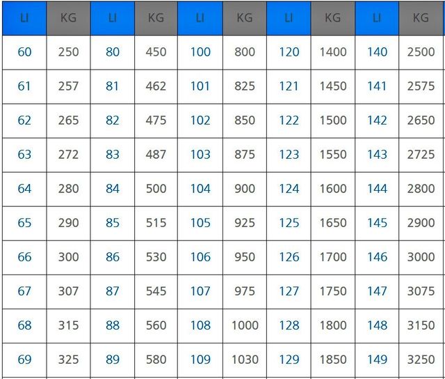 이미지에 있는 타이어의 하중지수는 106입니다. 하중지수 표에 따르면, 해당 타이어 1개가 버틸 수 있는 무게는 950kg입니다. 네 개의 타이를 기준으로, 3800kg의 하중을 견딘다는 뜻입니다.