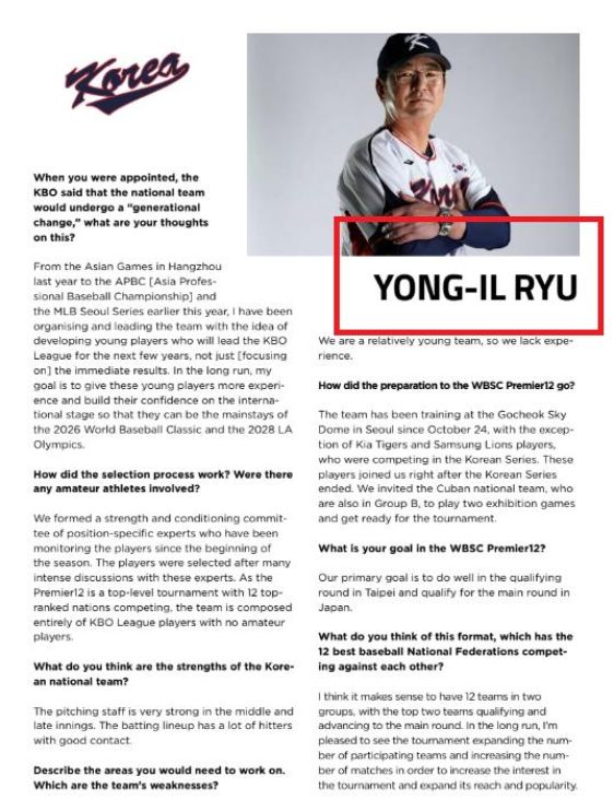 현재 프리미어12 공식 홈페이지에서 안내하는 대회 공식 소개집에는 류중일 감독의 영문 이름이 'JOONG-IL RYU(류중일)'이 아닌 'YONG-IL RYU(류용일)'로 명시돼 있다. 소개집이 대회 개막에 앞서 일찍 만들어진 탓인지 부상으로 대표팀에서 낙마한 구자욱과 원태인(이상 삼성 라이온즈) 등이 주목할 선수로 조명된 건 그렇다 쳐도 기본이 되는 이름을 오기한 건 문제라는 지적이다.