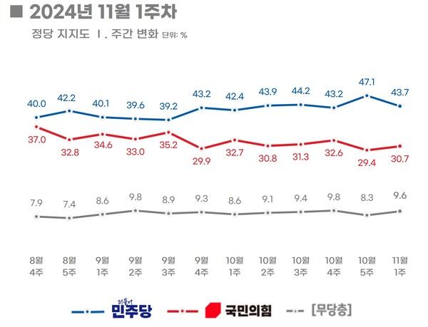 국힘 30.7%·민주 43.7%.. 양당 격차 17.7%P → 13.0%P