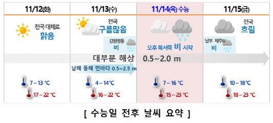 수능일 하늘은 북쪽을 지나는 기압골의 영향으로 대체로 흐리겠다. 오후부터는 북서쪽 지역에서 비가 시작돼 밤에는 전국 대부분 지역으로 확대될 것으로 보인다. 이 비는 일부 지역에서 수능 다음날인 15일까지 이어지겠다. 기상청은 “강수량은 많지 않고 낙뢰 등 위험 기상이 동반될 가능성은 낮겠으나, 도로가 미끄럽겠으니 교통 안전에 유의해야 한다”고 강조했다.