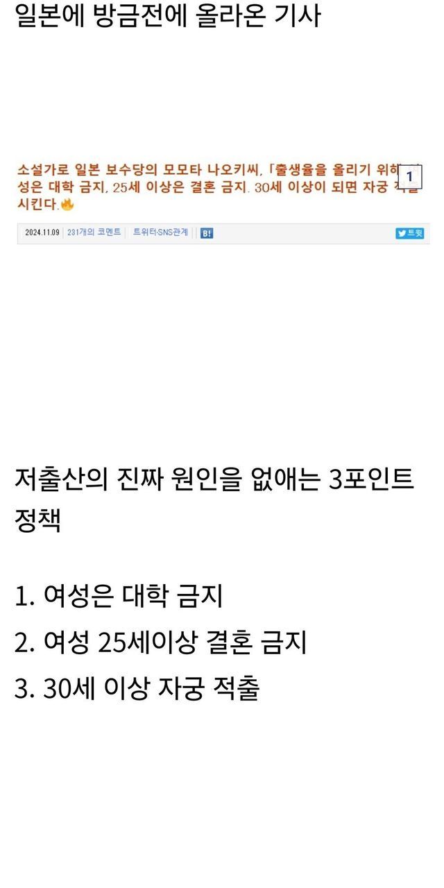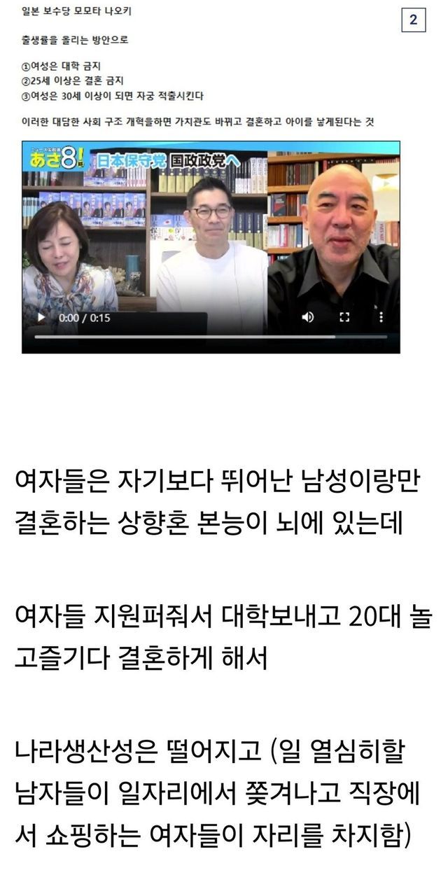 ???: 여성은 대학 진학 금지, 25세 이상 결혼 금지, 30세 이상 미혼 여성은 자궁 뽑아야 한다.