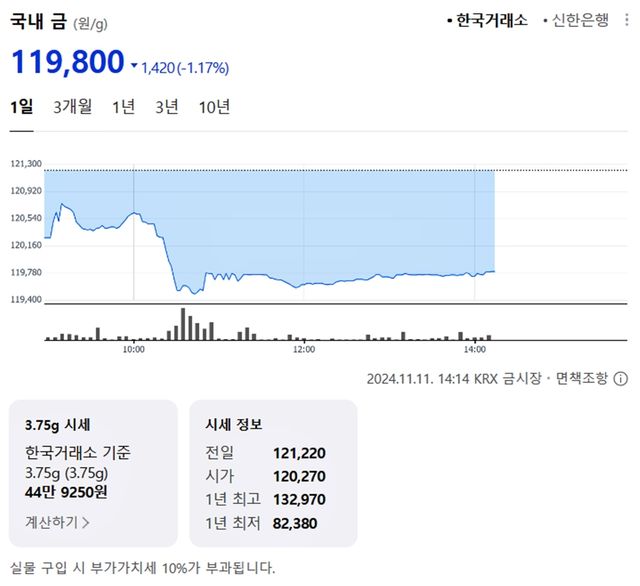 국내 금시세(금값)가 11일 오후 하락세(전 거래일 대비)를 보이고 있다.