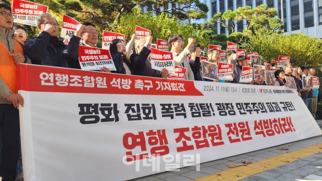 전국민주노동조합총연맹(민주노총)은 11일 오후 서울 서대문구 경찰청 앞에서 ‘연행조합원 석방 촉구’ 기자회견을 열고 “평화집회에 폭력으로 강경 대응한 경찰”이라며 “집회 도중 연행된 노동자 전원을 즉각 석방하라”고 촉구했다.