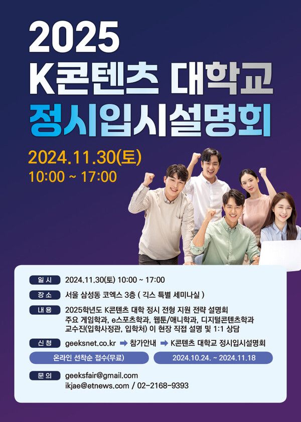 올해 긱스(GEEKS) 2024부터는 게임, e스포츠, 웹툰, 애니메이션, 미디어콘텐츠 학과 진학에 관심있는 수험생 및 학부모들을 위해 ‘2025 K콘텐츠 대학교 정시입시 설명회’를 마련한다. 긱스(GEEKS)2024에 전시에 출품하는 각 대학 게임,e스포츠,웹툰,디지털콘텐츠학과 현직 교수진과 입학처에서 각 대학별 정시전형 요강 및 지원전략을 소개하므로, 실질적인 정시 입시 지원에 도움될 전망이다.