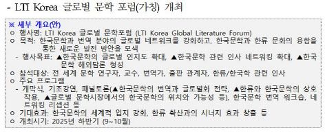 번역원은 해외에서 한국문학에 대한 담론 형성이 촉진되도록 외국의 문학 연구자와 번역가, 출판 관계자가 참석하는 가칭 ‘LTI Korea 글로벌 문학 포럼’(2025년 하반기 9~10월께)을 열고, 한국문학에 대한 학술 논의를 활성화하는 등 현지어 저술지원 및 기획 번역 확대, 전문가 기고를 지원하기로 했다.