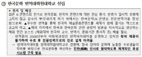 번역원은 기존 문학-문화콘텐츠 번역인력 양성기관인 번역아카데미를 대학원대학으로 격상해 정식 학위과정의 교육기관으로 전환한다는 방침이다. 앞서 국회 문화체육관광위원회 소속 김윤덕 더불어민주당 의원은 지난달 대학원대학 설립을 골자로 한 문학진흥법 개정안을 발의했다.