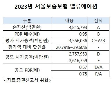 서울보증보험은 2023년 10월 첫 기관수요예측을 진행할 당시 평가 밸류를 4조5560억원으로 제시했다. 2023년 상반기 말 순자산(4조8157억원)에 피어그룹 평균 PBR(주가순자산비율) 0.95배를 곱한 수치다.