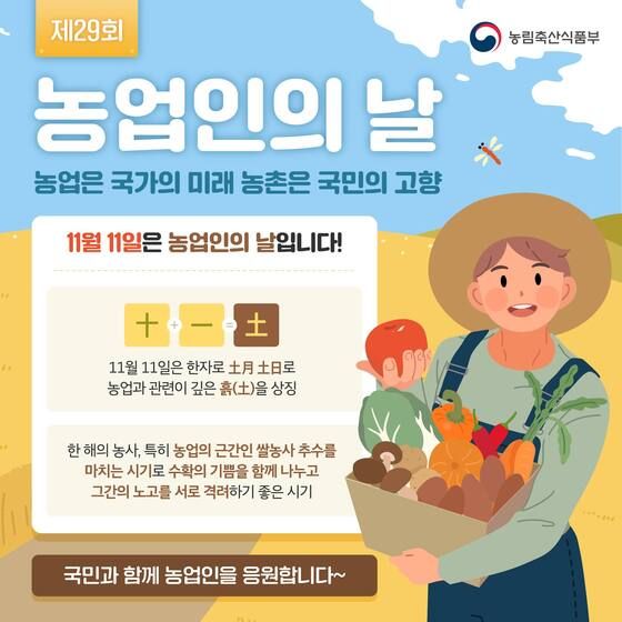 농림축산식품부는 11일 제29회 농업인의 날을 맞아 농업인들의 노고를 격려하고 자긍심을 고취하기 위해 농협중앙회 대강당에서 ‘농업, 꿈을 심다. 미래를 잇다’(부제 : 마음을 잇는 농업, 희망을 심는 농촌)라는 슬로건으로 기념식을 개최했다고 밝혔다.