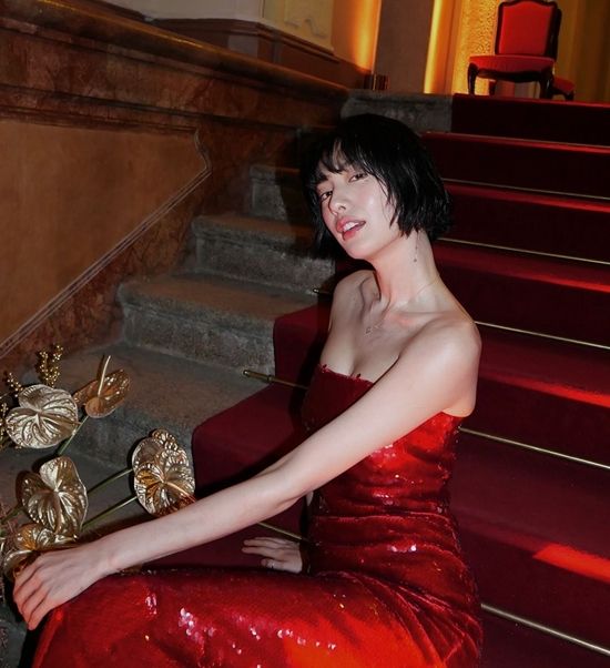 사진 속 나나는 빨간 스팽글이 달린 원피스를 입고 남다른 기럭지를 자랑하고 있다. 또한 검은색 스팽글의 홀터넥 미니 원피스로 아찔한 분위기를 완성했다.