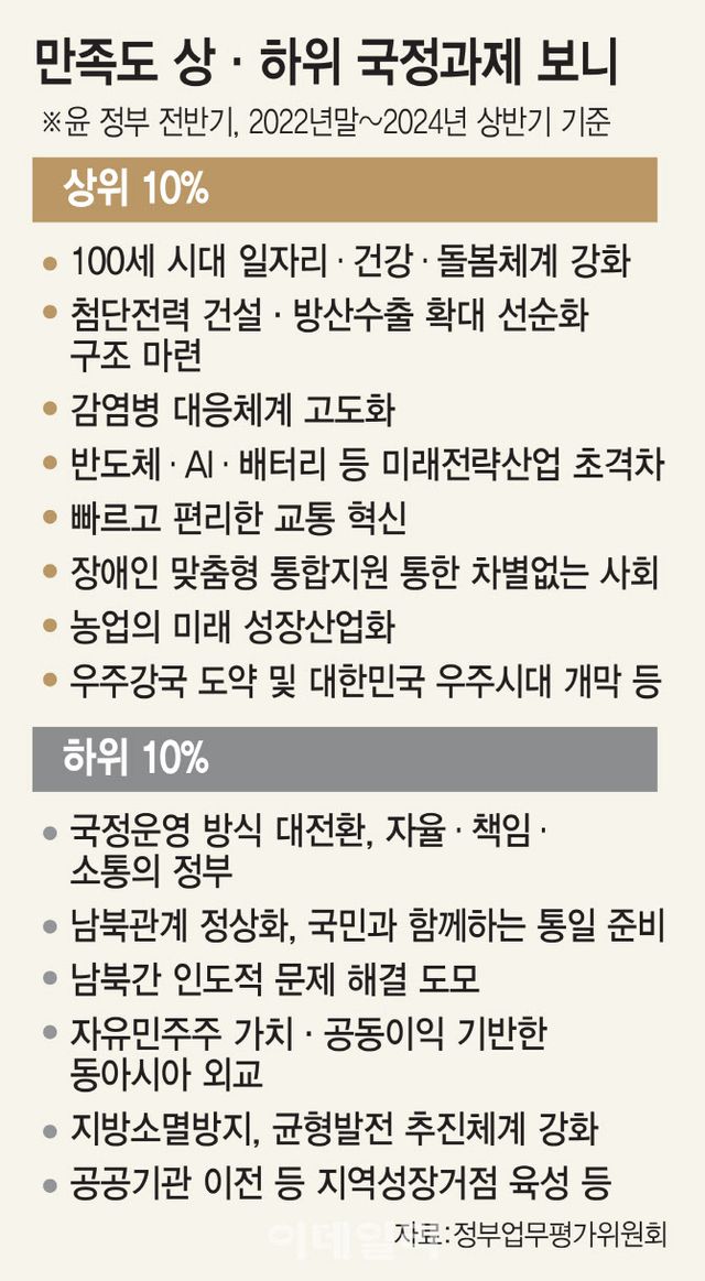 반면 4차례 조사에서 모두 만족도 하위 10%에 오른 과제는 △국정운영 방식의 대전환, 자율·책임·소통의 정부 △남북관계 정상화, 국민과 함께하는 통일 준비 △남북간 인도적 문제 해결 도모 등으로 집계됐다. 국민들이 ‘정부가 매우 못하고 있다’고 꼽은 과제들인 셈이다.