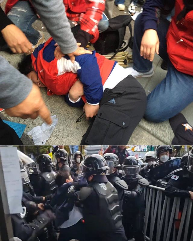 이들은 "민주노총은 경찰 측에 여러 차례 집회 장소 협조를 요청했으나 경찰은 충분한 공간을 불허했다"며 "경찰은 집회 장소로 이동하거나 집회 장소에 앉아있던 조합원을 강제로 밀어붙이면서 총돌을 유발했다"고 했다. 그러면서 "참가자들이 "사람이 쓰려졌다" "이러면 다친다"고 외쳐도 막무가내였다"고 전했다.