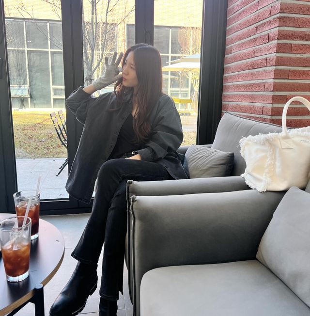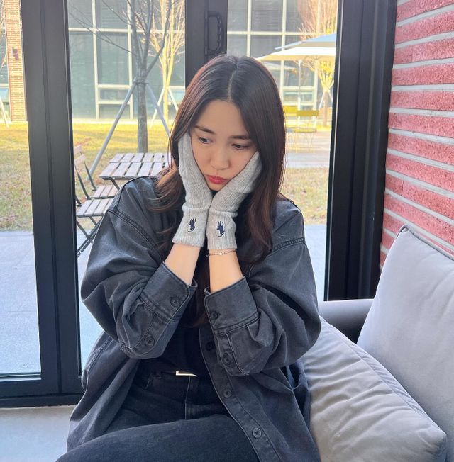 사진 속 진아름은 그레이 컬러의 데님 셔츠와 장갑, 청바지를 입고 다양한 포즈를 취하고 있다.