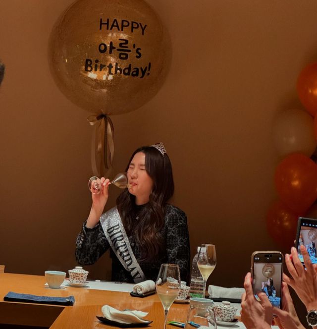 왕관으로 공주 착장을 한 진아름은 명품 브랜드의 의상을 입고 와인을 마시며 축하를 받았다.