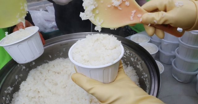 대한적십자 회원이 도시락밥을 담고 있다. (기사 이해를 돕기 위한 자료 사진) / 연합뉴스